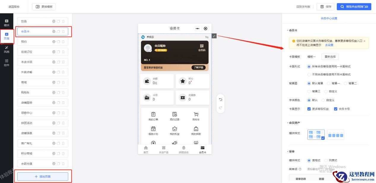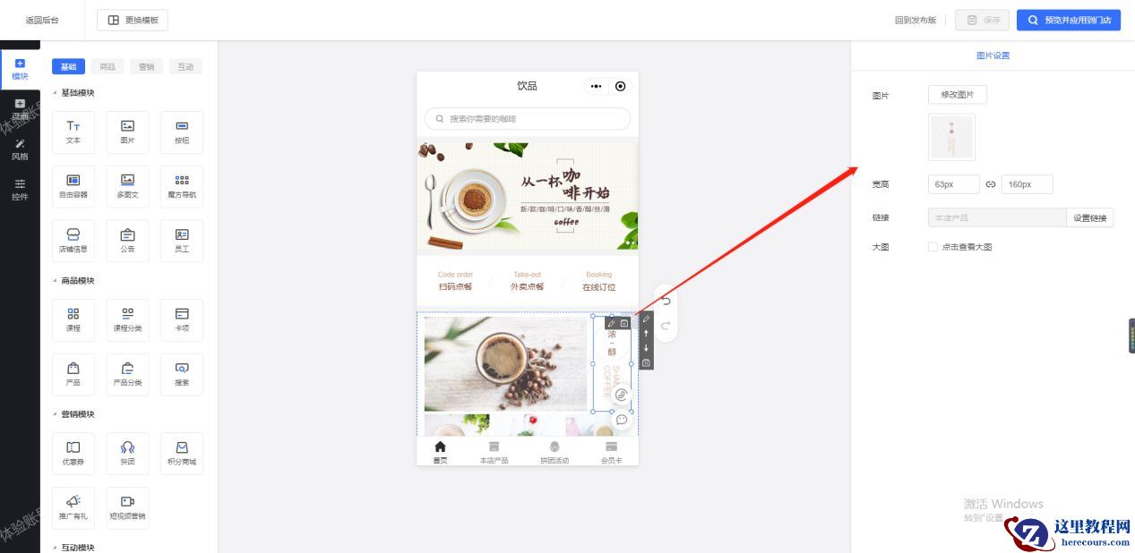 例如,可直接点击模板中要修改的内容进行编辑与设置,其中的文字、图片、功能、底部导航栏等内容都可如此点击编辑修改。