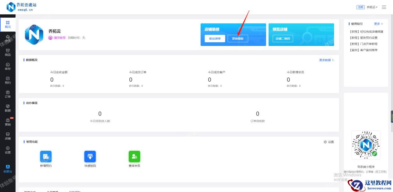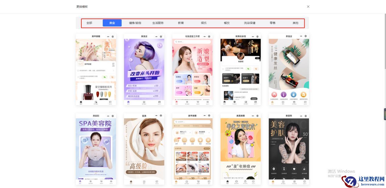 2. 在后台管理页面,点击【店铺装修-更换模板】选择一个合适的小程序店铺模板(其中有美容美发、健身瑜伽、生活服务、娱乐、餐饮、零售等实体行业的小程序店铺模板)。