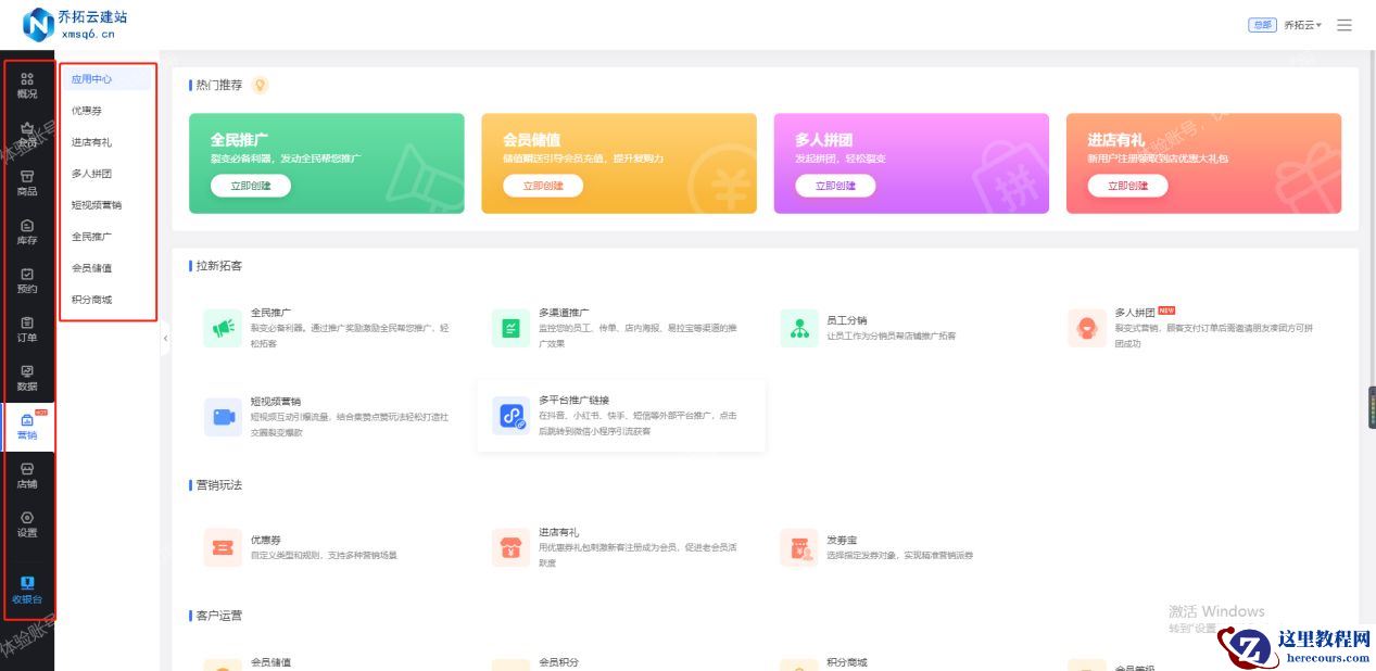 我们先来看看在乔拓云门店系统中要如何进行餐饮店的线上引流推广。小编了解到,乔拓云门店系统中有优惠券、进店有礼、多人拼团、会员储值、积分商城以及短视频营销等线上营销推广方式,可助力餐饮实体店进行线上促销推广,引流客源,从而提高门店的客流量与营业额。