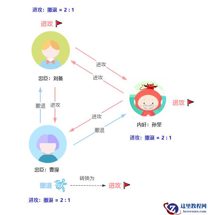 假如孙坚使诈,给曹操发送撤退指令,给刘备发送进攻指令,那么刘备收到的作战信息是进攻 3票,肯定会发起进攻了,而曹操收到的作战信息是进攻 2 票,撤退 1 票,最后曹操还是会进攻,所以刘备和曹操还是联合作战击败了反贼董卓。