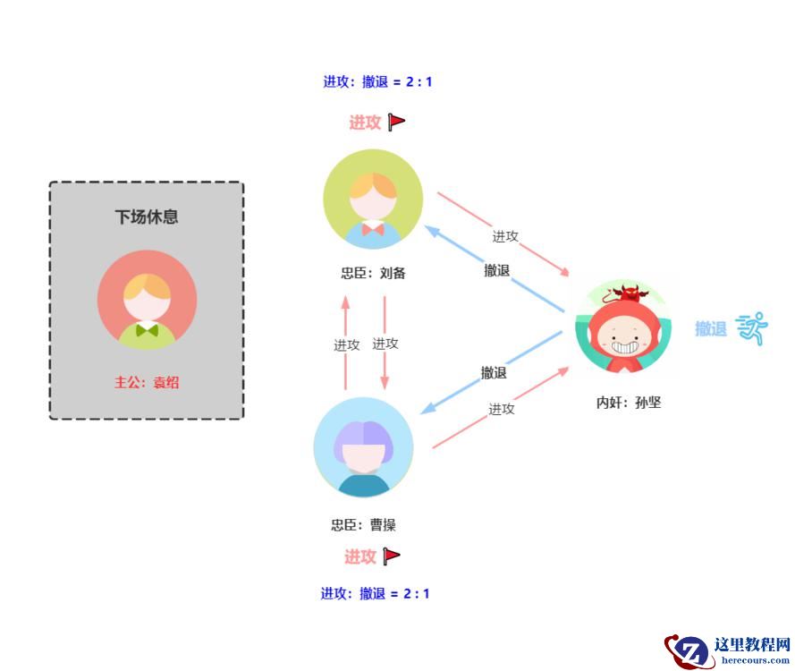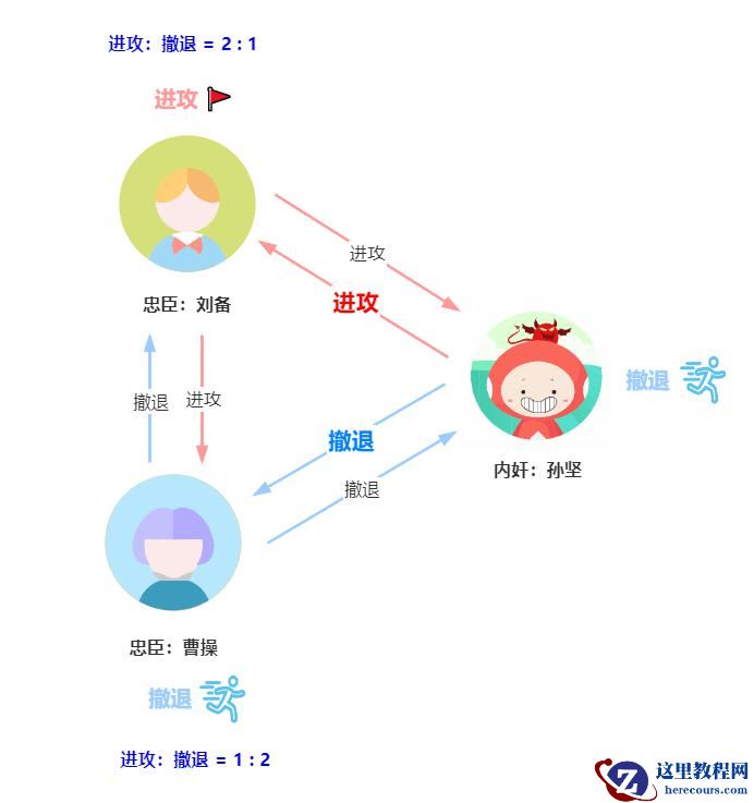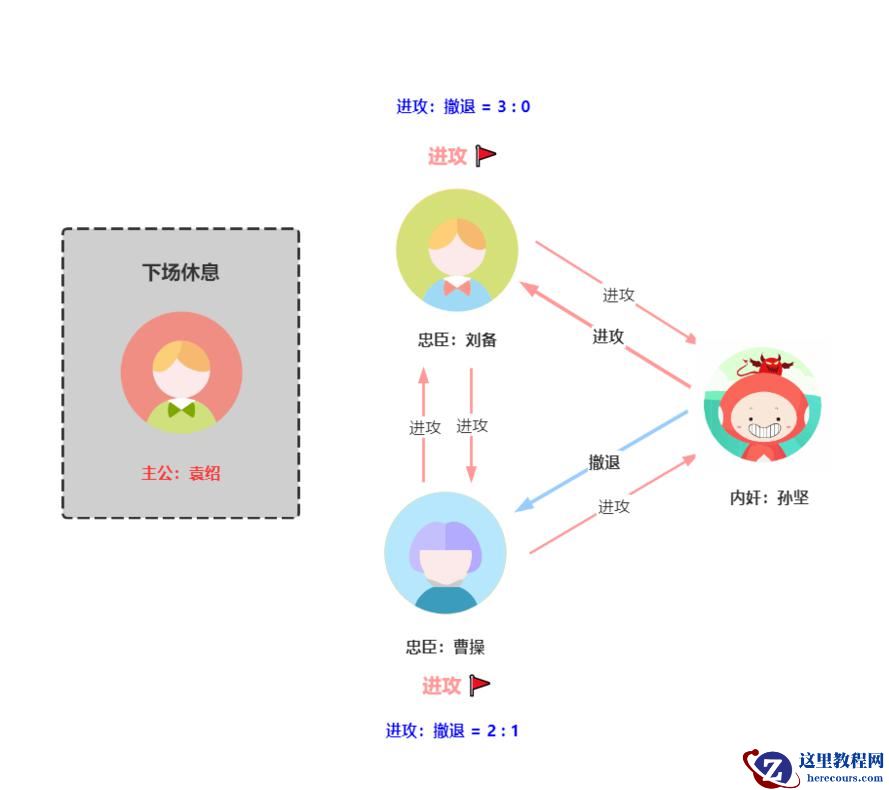 第一轮孙坚向其中一个副官袁绍发送撤退指令,向另外两个副官曹操、刘备发送进攻指令。那么第一轮的结果如下图: