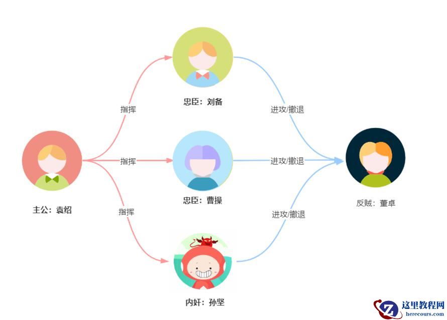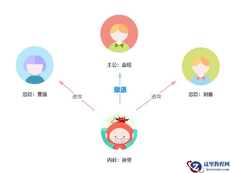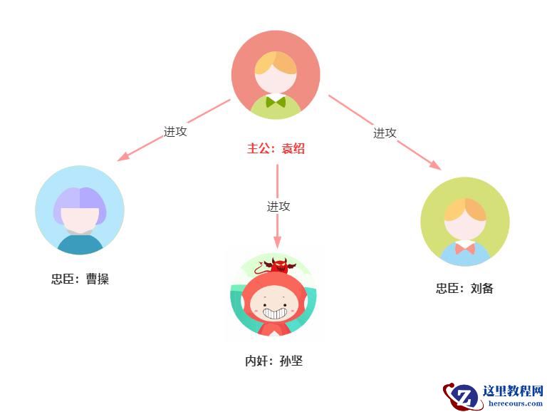 我们用图来演示:袁绍作为主公先发送作战信息,作战指令为进攻。然后曹操、刘备、孙坚收到进攻的作战指令。