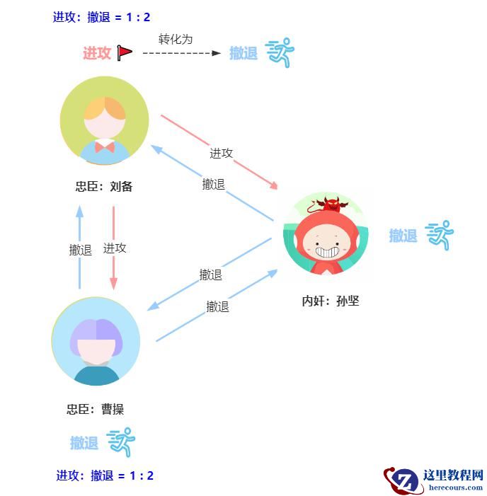 比如上述的攻打董卓问题,曹操、刘备、孙坚三个人当中,孙坚是叛将,他可以使诈,使作战计划不统一。必须增加一位忠臣袁绍来协商共识,才能达成一致性作战计划。
