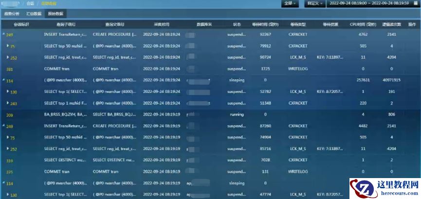 登录到SQL专家云,进入相关时间的活动会话的原始数据页面,看到很多会话的等待类型是CXPACKET,并且等待时间达到了几十秒。