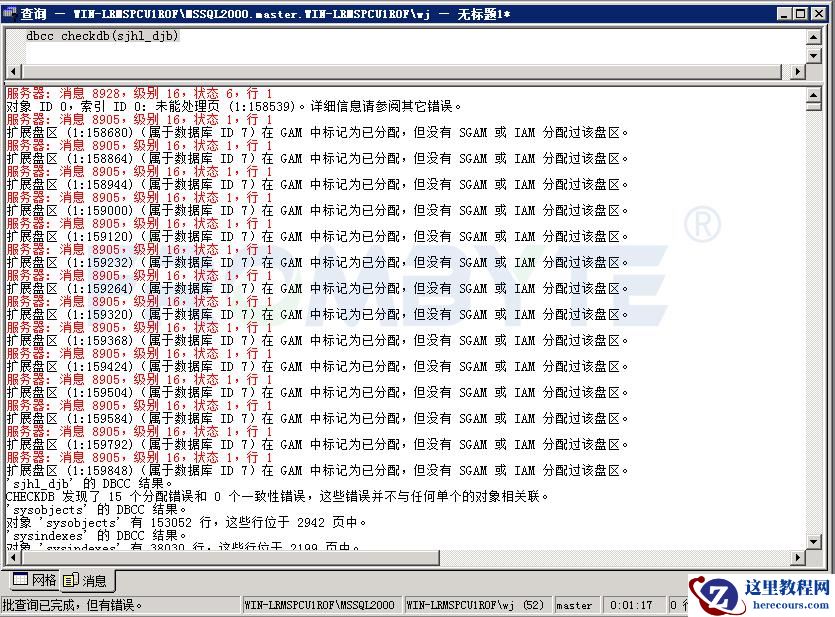 6、修复上述错误,再一次使用dbcc检测数据库。
