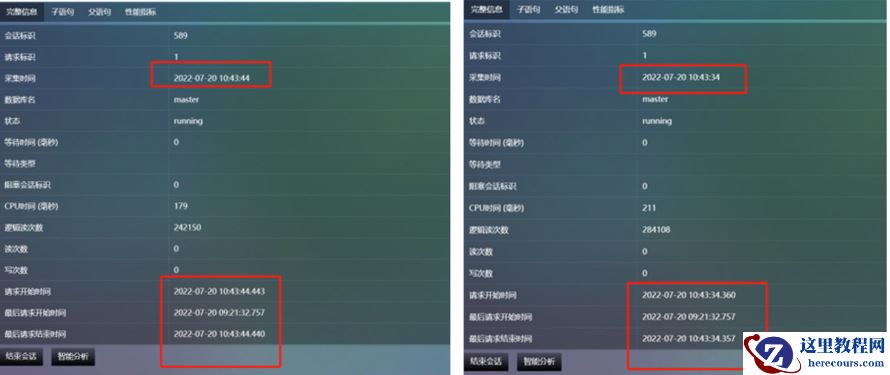 在链接服务器的目标端8.56中,查看会话589在不同采集时间点的活动会话,看到该会话的请求开始时间、最后请求开始时间、最后请求结束时间三个数据是变化的,