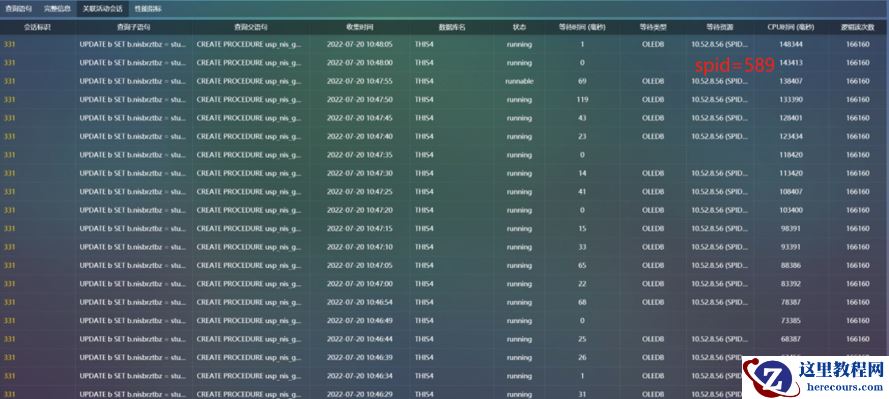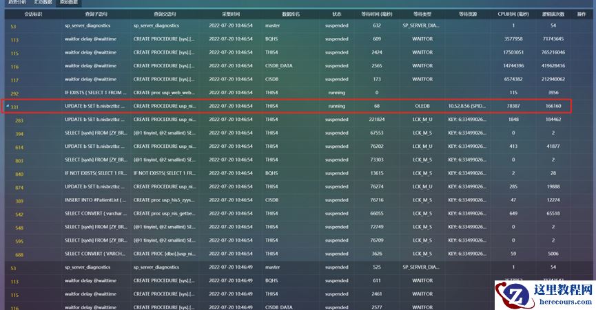 会话331对表执行UPDATE操作,阻塞其它会话对该表的写入和查询,这是正常的,也是好理解的。分析的重点是为什么执行时间这么长,而且全部都是链接服务器的等待(OLEDB)。