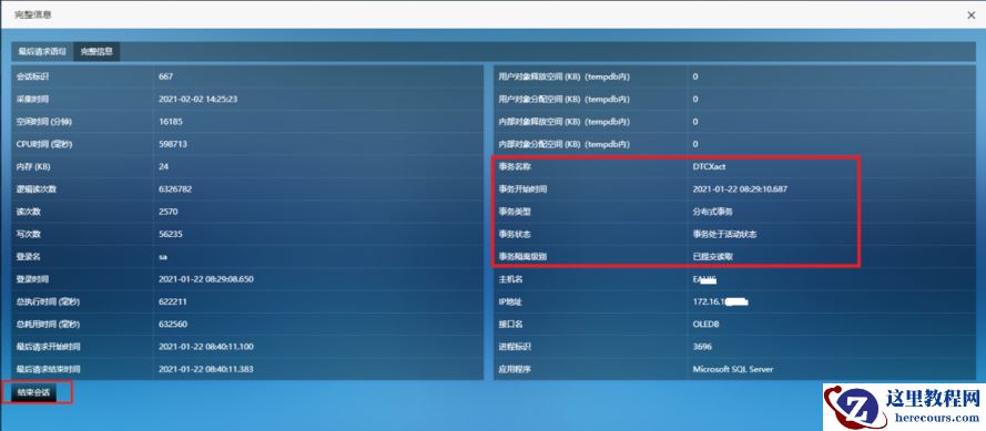 点击进入完整信息,可以看到该会话在1月22日8点29分08秒建立的,在1月22日8点29分10秒开始了一个事务,在 1月 22日8点40分11秒后执行最后一条语句后不再执行语句,到目前为止该事务已经开了11天的时间。