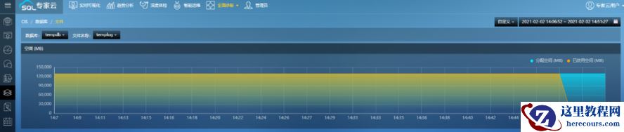 点40分之前,tempdb日志文件的总大小(蓝线)一直保持在500M,使用空间(黄线)也能被重用。从这个时间点之后,