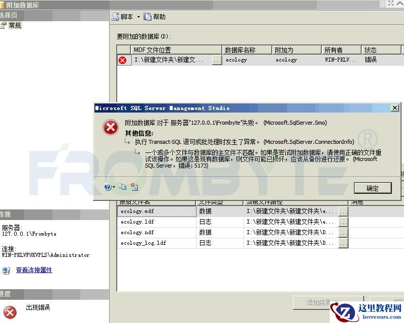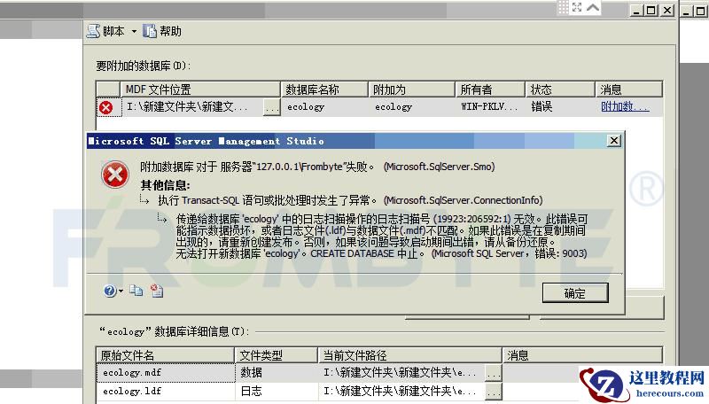 4、从虚拟重组出来的RAID5的空间中将管理员备份的数据库文件拷贝出来,尝试在数据库中附加,附加失败,错误提示如下: