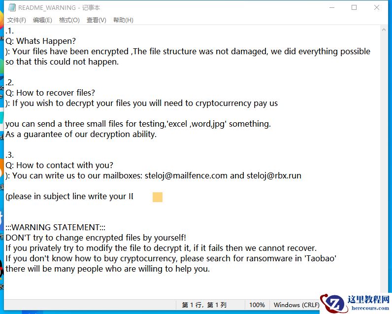 1, 桌面以及多个文件夹当中都有一封名为 README_WARNINNG 的文本文档。这个文档就是对方留下来的勒索信,目的就是简单的告知你您的服务器中招了,以及怎么样恢复您的数据等信息。