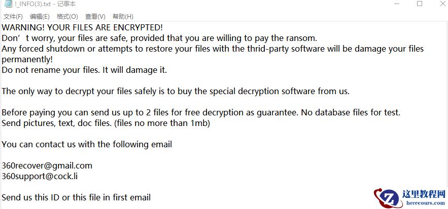 (2) 勒索信息,在计算机的桌面与任何一个文件夹都会留下一封 !_INFO.txt 的勒索信息,要求在一定时间内支付赎金,否则就会无法恢复数据,造成数据丢失,赎金一般金额在几百到几千美金不等,但对企业来说这也是不小的非必要开支。