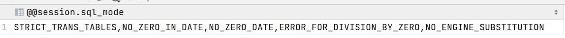 -- 会话级生效(仅当前连接有效) SET @@session.sql_mode = 'ONLY_FULL_GROUP_BY,STRICT_TRANS_TABLES,NO_ZERO_IN_DATE,NO_ZERO_DATE,ERROR_FOR_DIVISION_BY_ZERO,NO_ENGINE_SUBSTITUTION'; -- 简写形式(效果同上) SET sql_mode = 'ONLY_FULL_GROUP_BY,STRICT_TRANS_TABLES,NO_ZERO_IN_DATE,NO_ZERO_DATE,ERROR_FOR_DIVISION_BY_ZERO,NO_ENGINE_SUBSTITUTION';