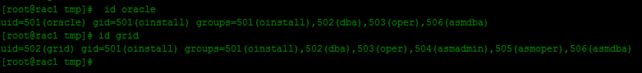 uid=501(oracle) gid=501(oinstall) groups=501(oinstall),502(dba),503(oper),506(asmdba)