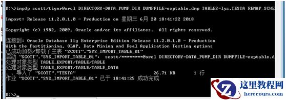 这边的意思是:impdp 倒入到 oracl库下的用户,倒入的路径为DATA_PUMP_DIR,倒入的dmp 文件为:exptable.dmp ,倒入的表为:TABLES=lyz.TESTA ,REMAP_SCHEMA=lyz:scott : 这边的意思是 从 lyz用户到scott用户,table_exists_action=REPLACE : 这边的意思是:如果表存在,就直接替换掉。