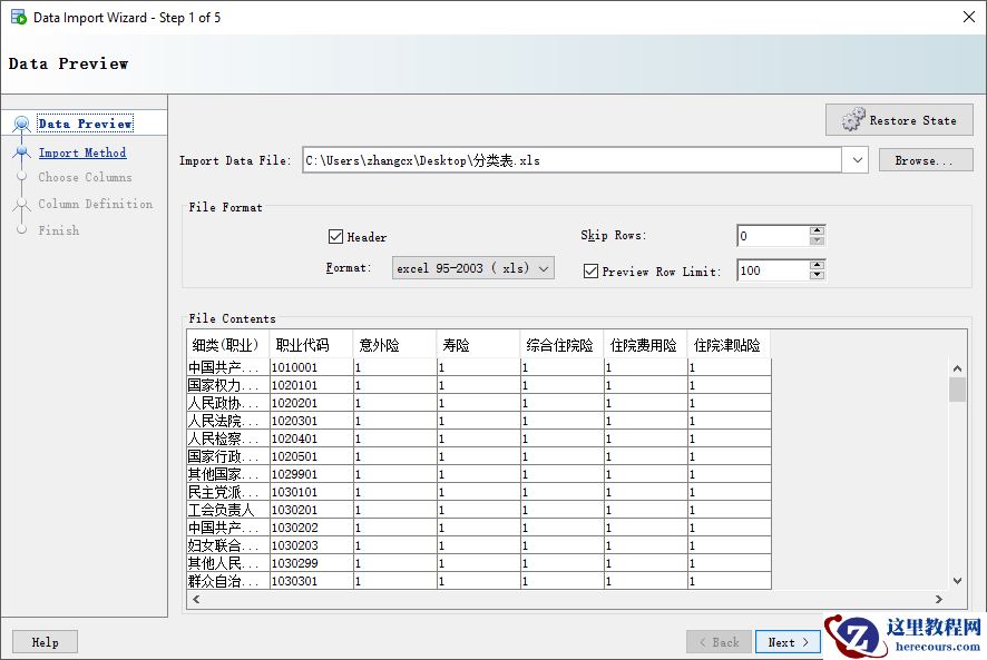 2、然后会出现数据导入向导,选择需要导入的Excel文件,工具会自动识别出头部,并显示部分会导入的数据: