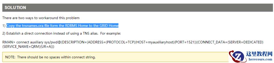 MOS上的解释是,引发ORA-12154的原因是因为该进程在辅助端的不同ORACLE_HOME中寻找tnsnames.ora。 辅助端的这个不同的ORACLE_HOME通常是GRID HOME。在11G RAC上,客户可以配置SCAN侦听器以处理DB和ASM实例上的故障转移连接。