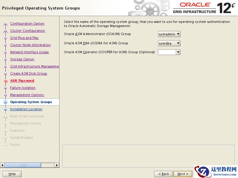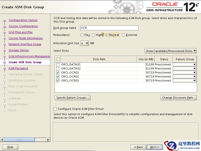 12.2增加了一个GIMR的概念,所谓GIMR其实就是用来存储集群信息的一个数据库,可以单独部署在一个磁盘组里,也可以和OCR共用一个磁盘组。这里要注意的是,如果选择和OCR共用磁盘组,磁盘组的容量需要40G(准备的说是3850MB)以上,否则会出现空间不足的错误。我们这里选择和OCR共用磁盘组。下一步创建OCR磁盘组:
