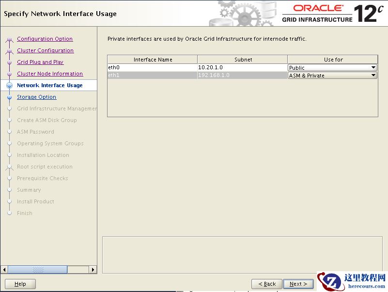 安装之前的规划,eth0网段10.20.1作为公共网络,而eth1网段192.168.1作为ASM和私有网络。然后配置ASM:
