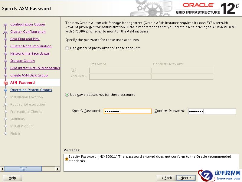 然后设置SYS和ASMSNMP的口令,这里为了方便将两个账号的口令设置成一样并且使用了比较简单的口令。在实际生产中出于安全考虑建议还是单独设置,并使用复杂的口令(安装程序会检查口令是否满足要求)。