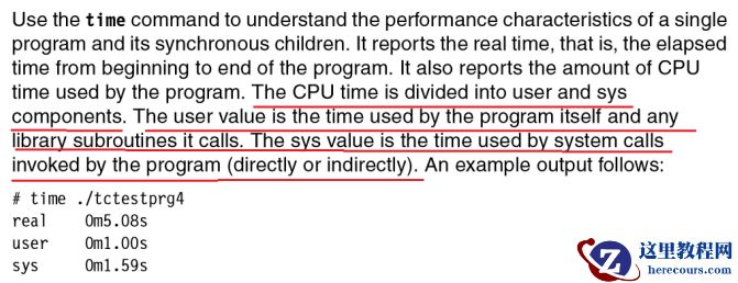可以看到其中的时间,分为 real,user 和 sys, 其中的 user 和 sys 便是指的是 CPU 时间,从 IBM 的 Performance and System Tuning 文档中看到了关于 time解释,其中对于user和sys的解释如下: