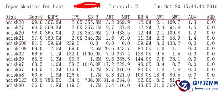 查看当时的磁盘情况发现 DISK28 、 27 、 20 、 21 四块盘异常繁忙,磁盘读特别高,每块盘的每秒平均达 350M 左右。