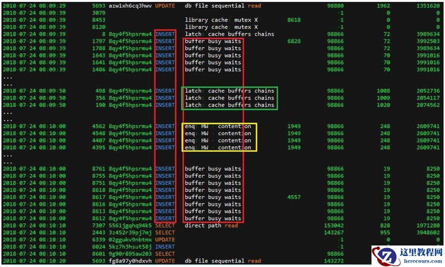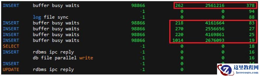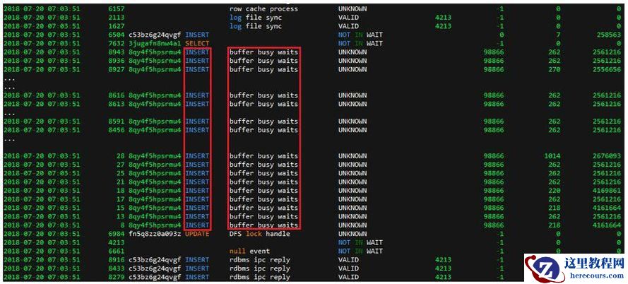 那系统中为何同时出现大量 INSERT 语句的会话?该时间点内应用确实发出如此多的 INSERT 语句?而又同时向相同的对象中插入数据产生的 ”buffer busy waits” ?还是由于 ”buffer busy waits” 而引起的大量会话出现阻塞?