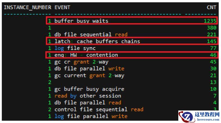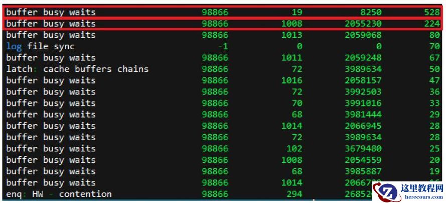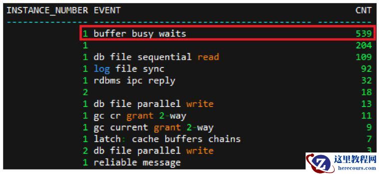 对等待事件进行汇总后,等待次数排名第一位的等待事件均为 ”buffer busy waits” ,如下:
