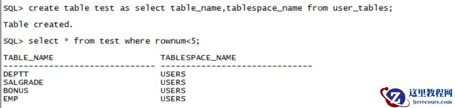 SQL>create table test as select table_name,tablespace_name from user_tables;