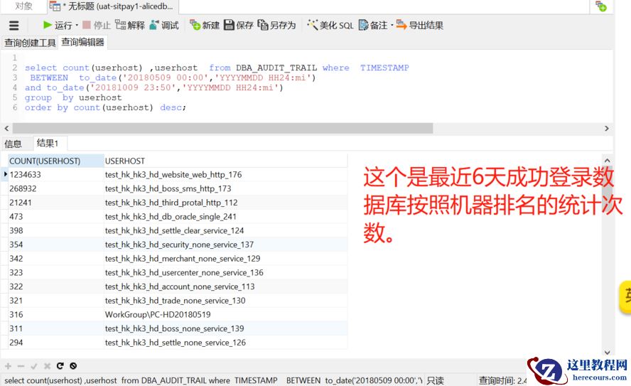 偶尔还会有一两台机器发起大量的数据库空连接请求。我在oracle的连接登录日志dba_audit_trail有如下统计: