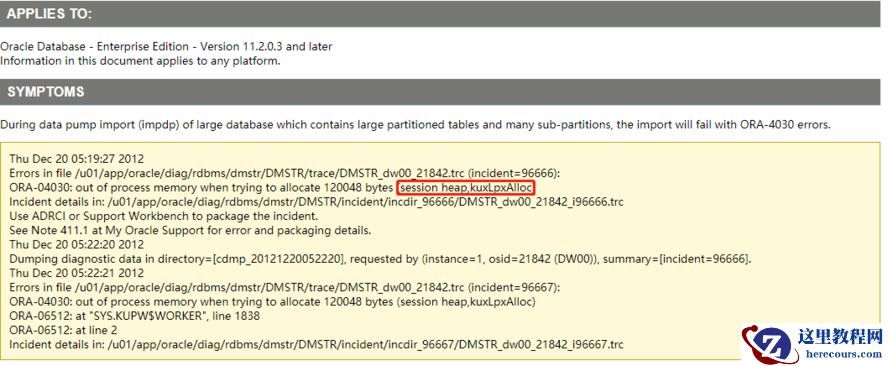 按照该文档的描述,在包含大型分区表和许多子分区的数据库的数据泵导入期间,会报ORA-04030导致导入失败。在11.2.x版本中,导入期间,这些对象的大量数据库统计信息会压缩导入期间的XML处理。这已被确定为Bug:14841775。在12.1版本中,数据库统计信息的导出和导入方式已经过重新设计,因此将不再出现内存资源问题。