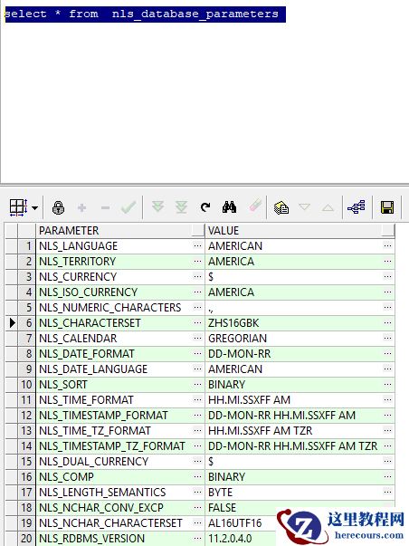 查询数据库字符集:select * from nls_database_parameters