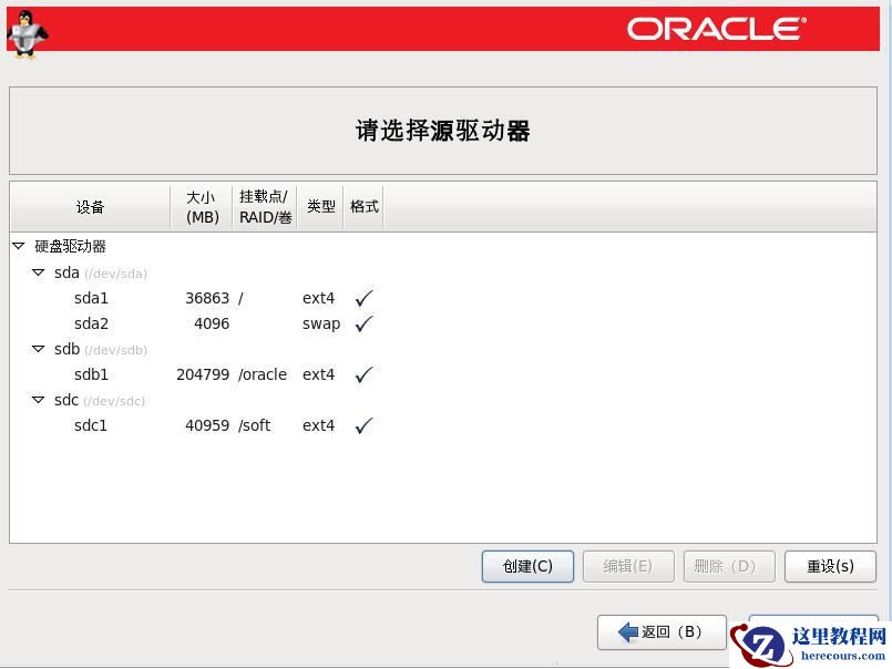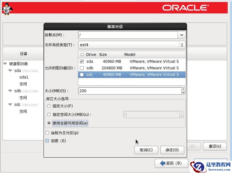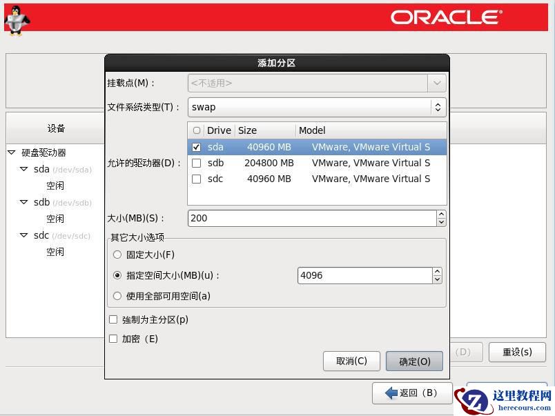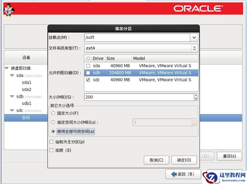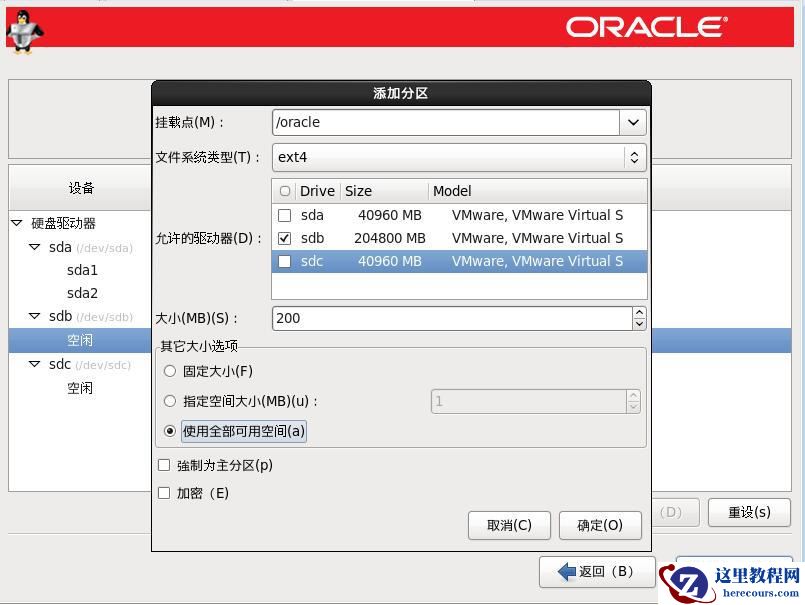 13、穿件Oracle挂载点,这里单独把Oracle安装路径单独放在一个路径下,建议硬盘至少200M。如图: