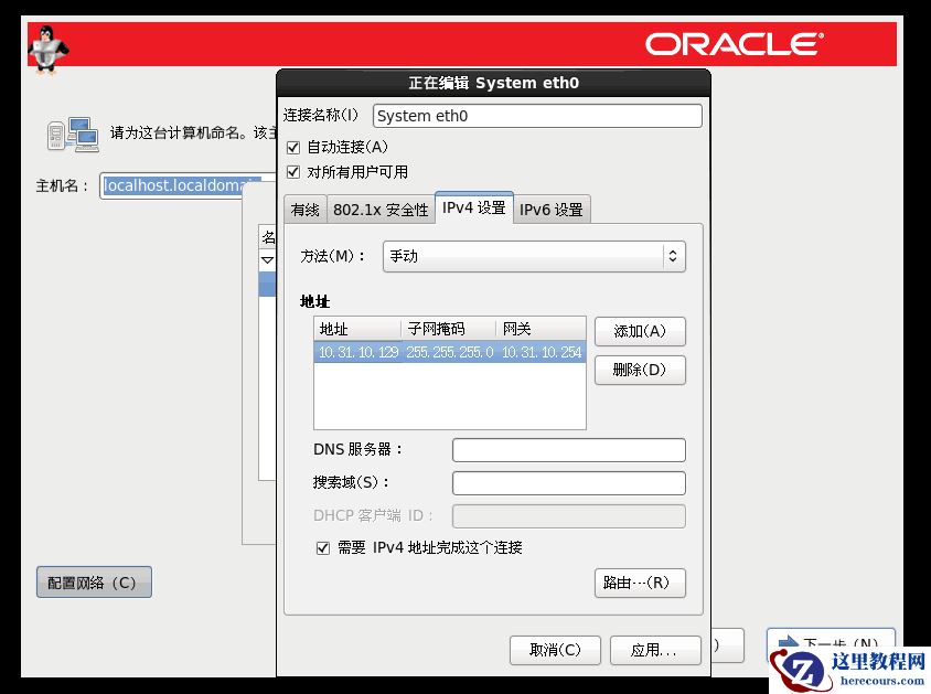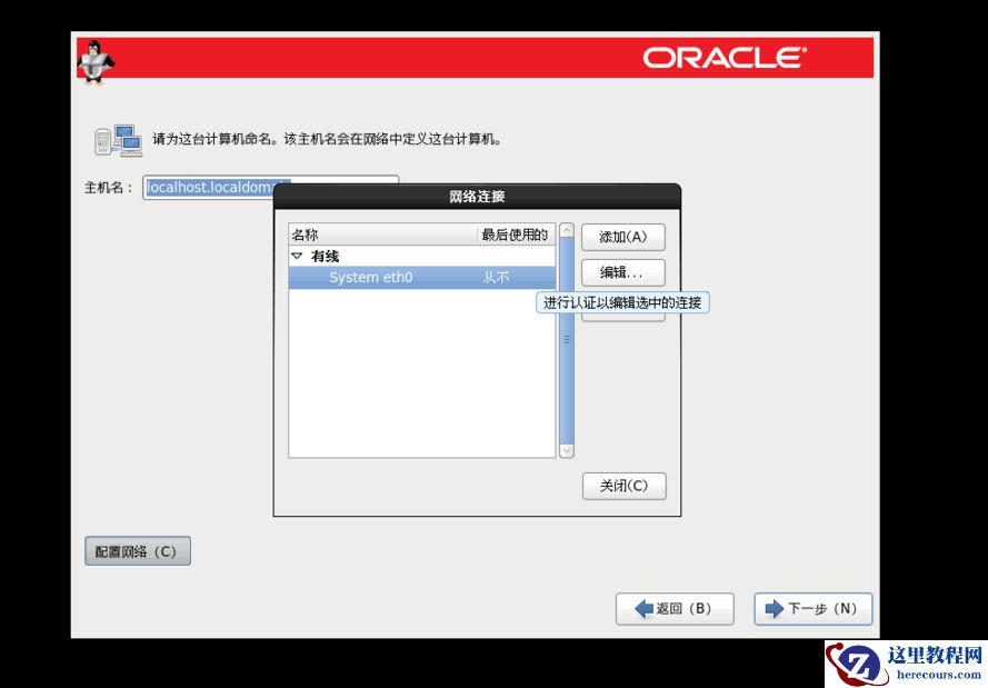 10、设置主机名(**),点击配置网络,选中eth0,进行编辑。