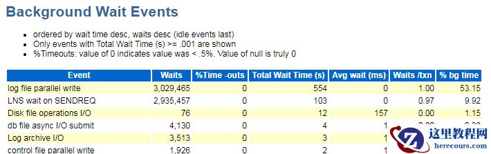 待插入完成后,拉取awr报告与ash报告,可看到在Top 10 Foreground Events by Total Wait Time中,log file sync等待时间为908s,占了总DB Time的71%;在Background Wait Events中,log file parallel write等待时间为554s,占整个Background Time的53%。