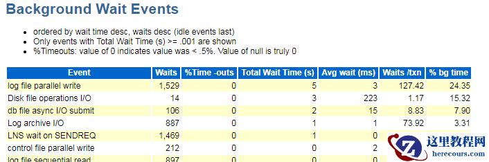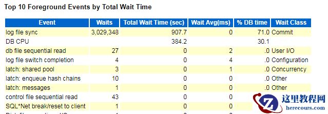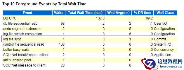拉取awr报告后,可看到log file sync只等待了一次,占比已经降下来了。log file parallel write占比仍比较高,这是因为我们的事务太大造成的。