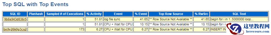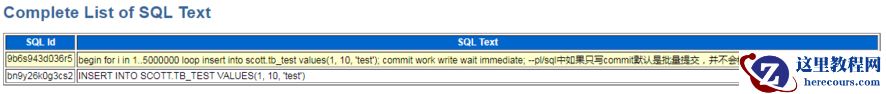 查看ash报告,再Top SQL with Top Events中可看到引起log file sync的SQL语句,查看完整脚本,正好是我们发出的语句