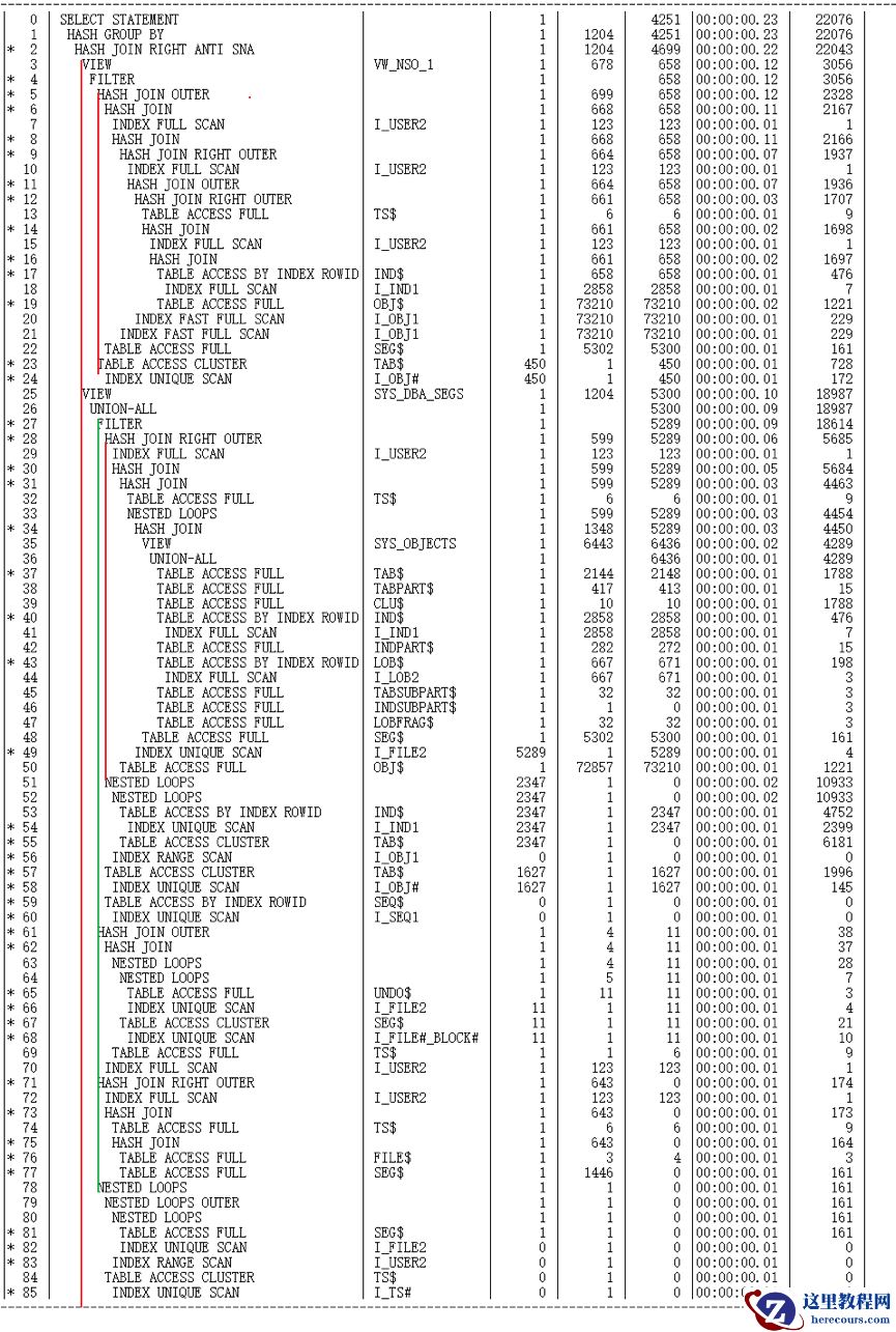 filter消除,CBO将基于数据字典底层的基表重新组合,使执行计划变成hash joinanti,0.23秒便执行完成了。