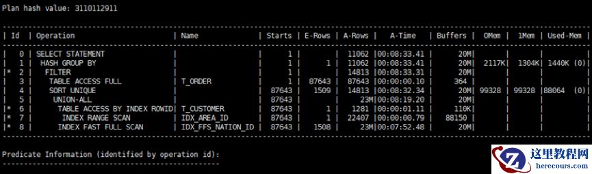 耗时一分钟,为什么这么慢呢?在SQL语句where子查询后有not in、not exists、in、exists时,CBO会尝试将子查询展开(unnest)消除filter,但是上面的例子CBO并没有做到,下面我们看下执行计划。