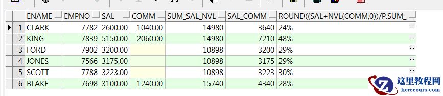select p.*,sal+nvl(comm,0) sal_comm,round((sal+nvl(comm,0))/p.sum_sal_nvl,2)*100||'%' from (select ename,empno,sal,comm,sum(sal+nvl(comm,0)) over (partition by deptno)