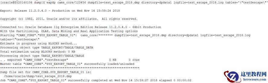 (2)在Linux下执行expdp或者impdp命令,如果需要导出名字较为特殊的表,可以使用单引号包含双引号的方式导出,但需要对双引号做转义。