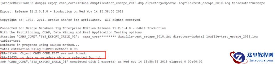 (3)显然Linux将$escape解析成为环境变量,但变量是个空值,所以提示ORA-39166和ORA-31655的错误。这里还测试了多组值,无一例外全部报错。