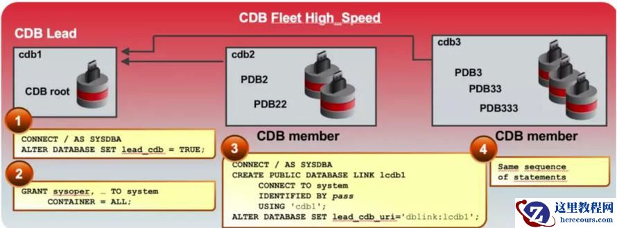 3)CDB Fleet的管理,不止于整合,更实现系统规范管理。将不同的CDB作为一个整体来管理,分配不同的CDB的角色。可以通过其中的leader角色统一负责资源的协调和管理,并对其他成员进行操作。