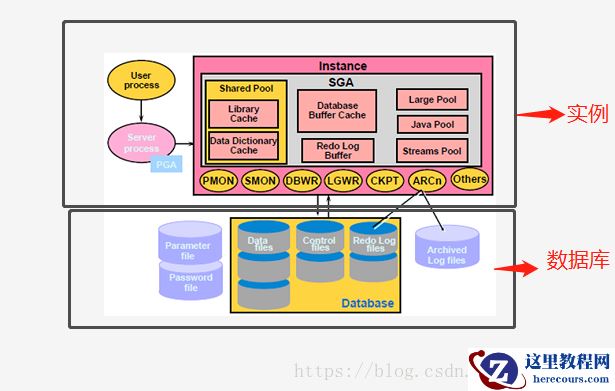 如你所见,以中间空白的为线,上面粉嫩嫩的部分便是Oracle实例部分,下面的便是数据库部分,那接下来我们便逐个进行剖析。