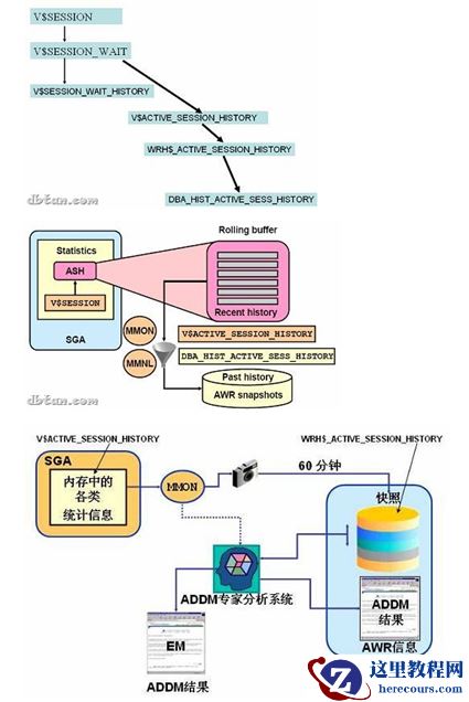 In addition to the v$session view, there are other dynamic performance views that are specialized in providing specific information. For example, v$session_wait provides only columns related to wait events, and v$session_blockers provides only columns related to blocked sessions. Active Session History 会话历史 v$session 只提供了当前 session 的状态,为了分析,需要知道过去一段时间的情况, active session history (ASH) V$ACTIVE_SESSION_HISTORY 显示数据库中的采样会话活动。 ASH 每秒从 v$session 中取快照,存在 V$ACTIVE_SESSION_HISTORY 中,并收集所有活动会话的等待信息。若 ASH 数据被刷新到磁盘,则需要从 DBA_HIS_ACTIVE_SESS_HISTORY 视图中查询相关信息。 V$ACTIVE_SESSION_HISTORY 类似 SQL Trace, 但好的是 V$ACTIVE_SESSION_HISTORY 总是可用的 . 可用通过给sample_time设定条件,来查询某段时间. 例子1: 比如下面的语句查询'2018-12-31 14:10:30'到15:10这10分钟DB Time最高的10条语句. SELECT activity_pct,db_time,sql_id FROM (SELECT round(100 * ratio_to_report(count(*)) OVER (), 1) AS activity_pct, count(*) AS db_time, sql_id FROM v$active_session_history WHERE sample_time BETWEEN to_timestamp('2018-12-31 14:10:30', 'YYYY-MM-DD HH24:MI:SS') AND to_timestamp('2018-12-31 15:10:30', 'YYYY-MM-DD HH24:MI:SS') AND sql_id IS NOT NULL GROUP BY sql_id ORDER BY count(*) DESC ) WHERE rownum <= 10; ACTIVITY_PCT DB_TIME SQL_ID ------------ ---------- ------------- 47.7 41 g6px76dmjv1jy 8.1 7 6hnhqahphpk8n 4.7 4 19qzxmgkk0mv9 3.5 3 16pgyra4xxuh9 3.5 3 196mqnmxgxpv1 3.5 3 8tvh9uyc6gmup 2.3 2 771ba8nfchrad 2.3 2 c85zupw0dgrm4 2.3 2 ghxaptwduxu9u 2.3 2 c3rvcbu8r3zx8 例子2: 过去10分钟DB Time最高的10条语句 SELECT activity_pct,db_time,sql_id FROM (SELECT round(100 * ratio_to_report(count(*)) OVER (), 1) AS activity_pct, count(*) AS db_time, sql_id FROM v$active_session_history WHERE sample_time > sysdate-10/(24 * 60) AND sql_id IS NOT NULL GROUP BY sql_id ORDER BY count(*) DESC ) WHERE rownum <= 10; 其它的一些例子: