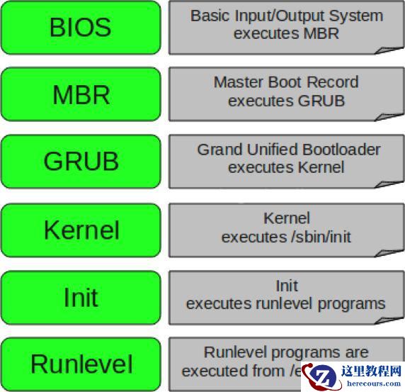 1)开机BIOS自检,且根据BIOS中配置的启动设备读取MBR并加载Bootloader程序。