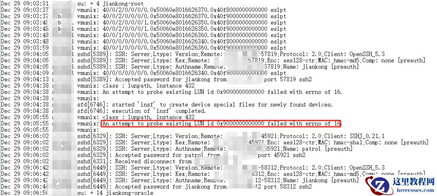 3、检查操作系统日志,发现问题时间点有root执行:ioscan -nf|grep -i E "unclaimed | unknown | NO_HW |SCAN"