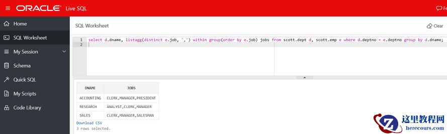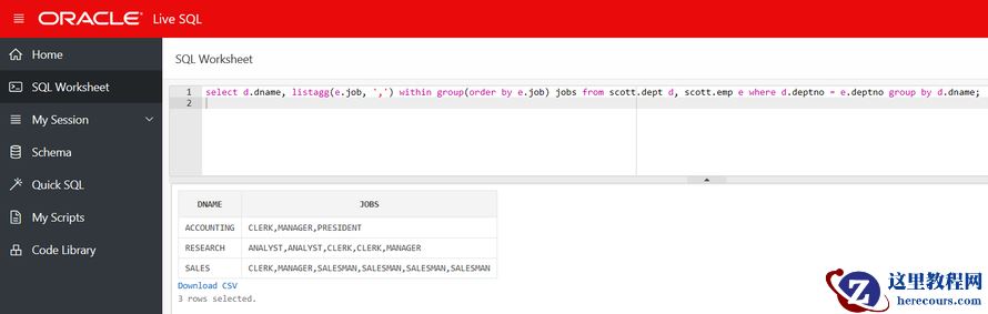 select d.dname, listagg(e.job, ',') within group(order by e.job) jobs from scott.dept d, scott.emp e where d.deptno = e.deptno group by d.dname;