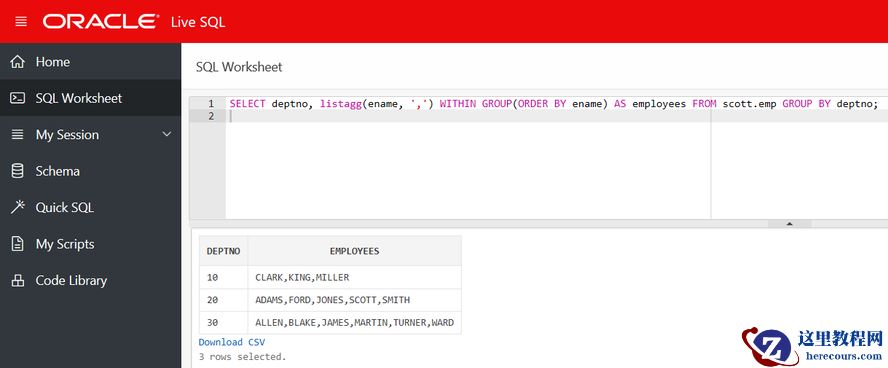 SELECT deptno, listagg(ename, ',') WITHIN GROUP(ORDER BY ename) AS employees FROM scott.emp GROUP BY deptno;
