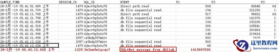 查看问题时间段数据库内部的等待事件,发现问题时间段前后有dblink读取数据。